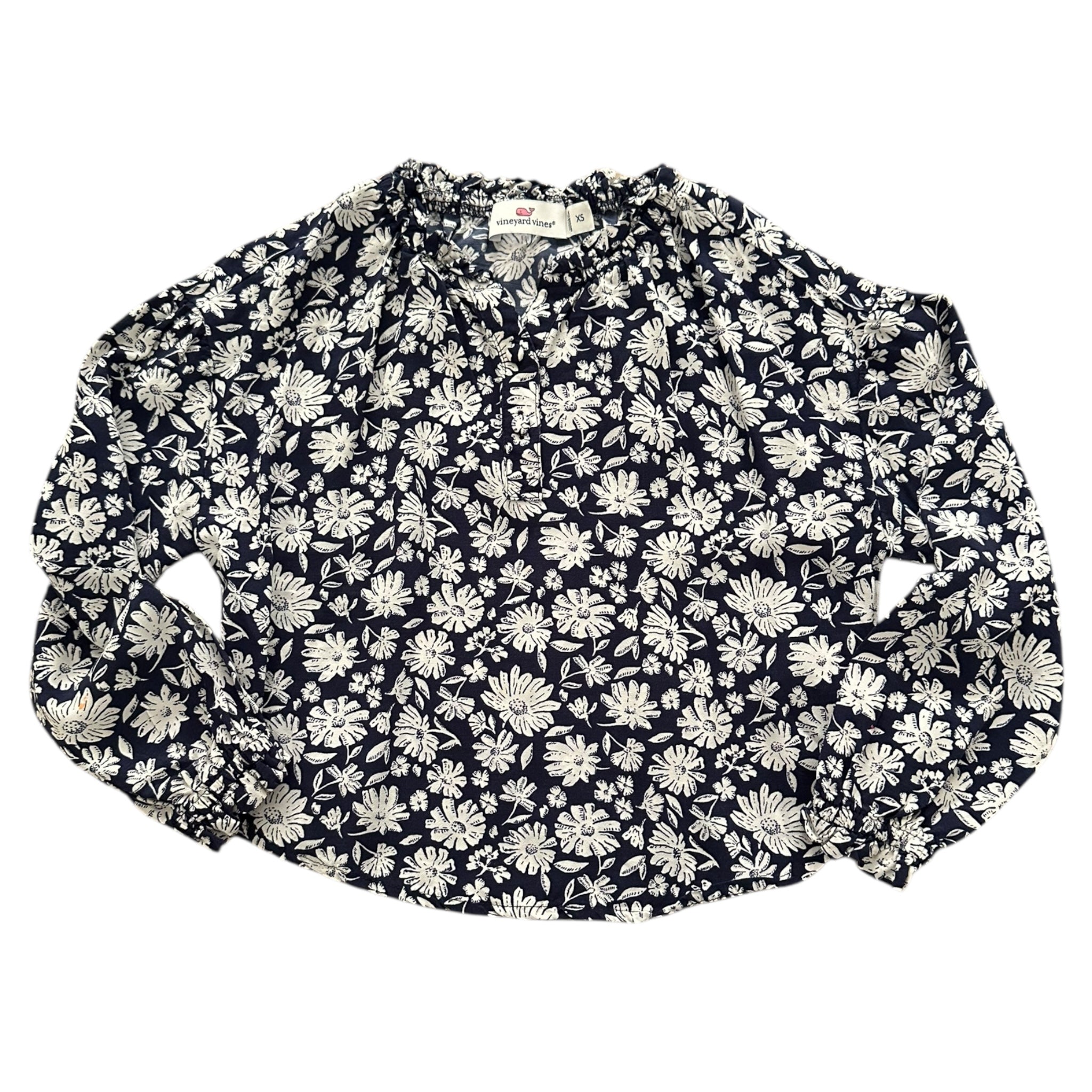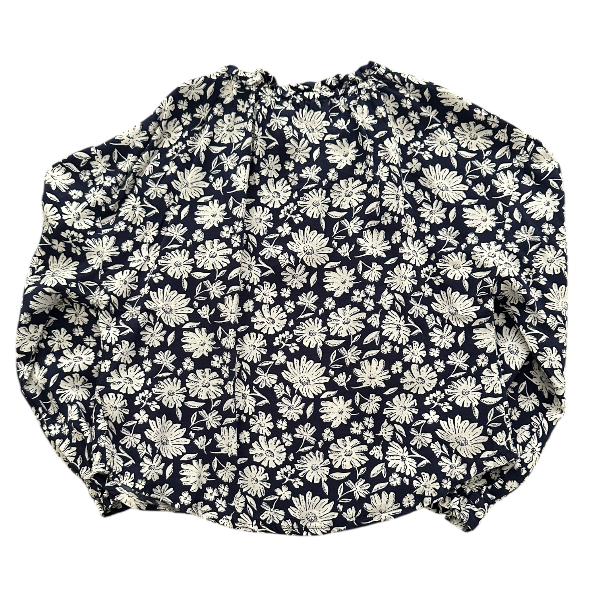 Blusa azul con estampado de flores balncas,botones en el opecho y elástico con vuelito en el cuello.