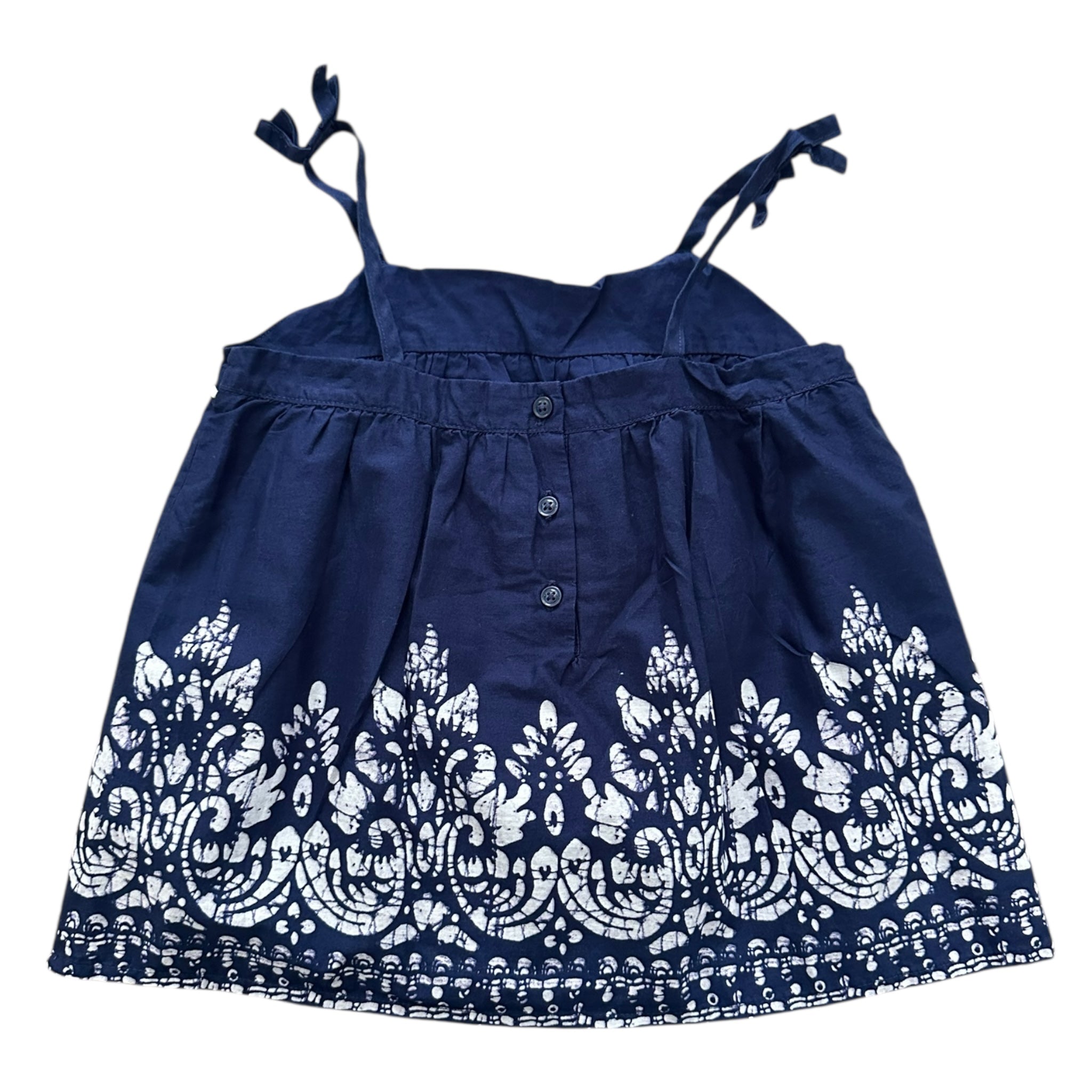 Top azul con forro y franja con print blanco tipo tie dye, tira de pompones blancos en el pecho y tirantes con moñita, tiene botones en la espalda