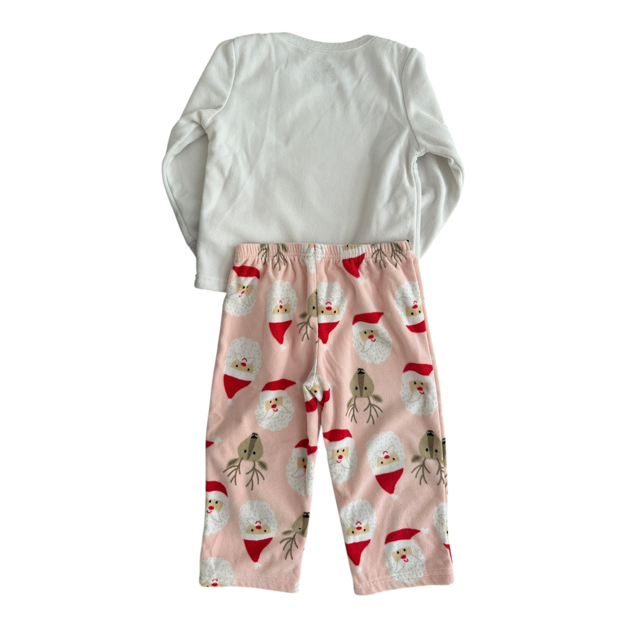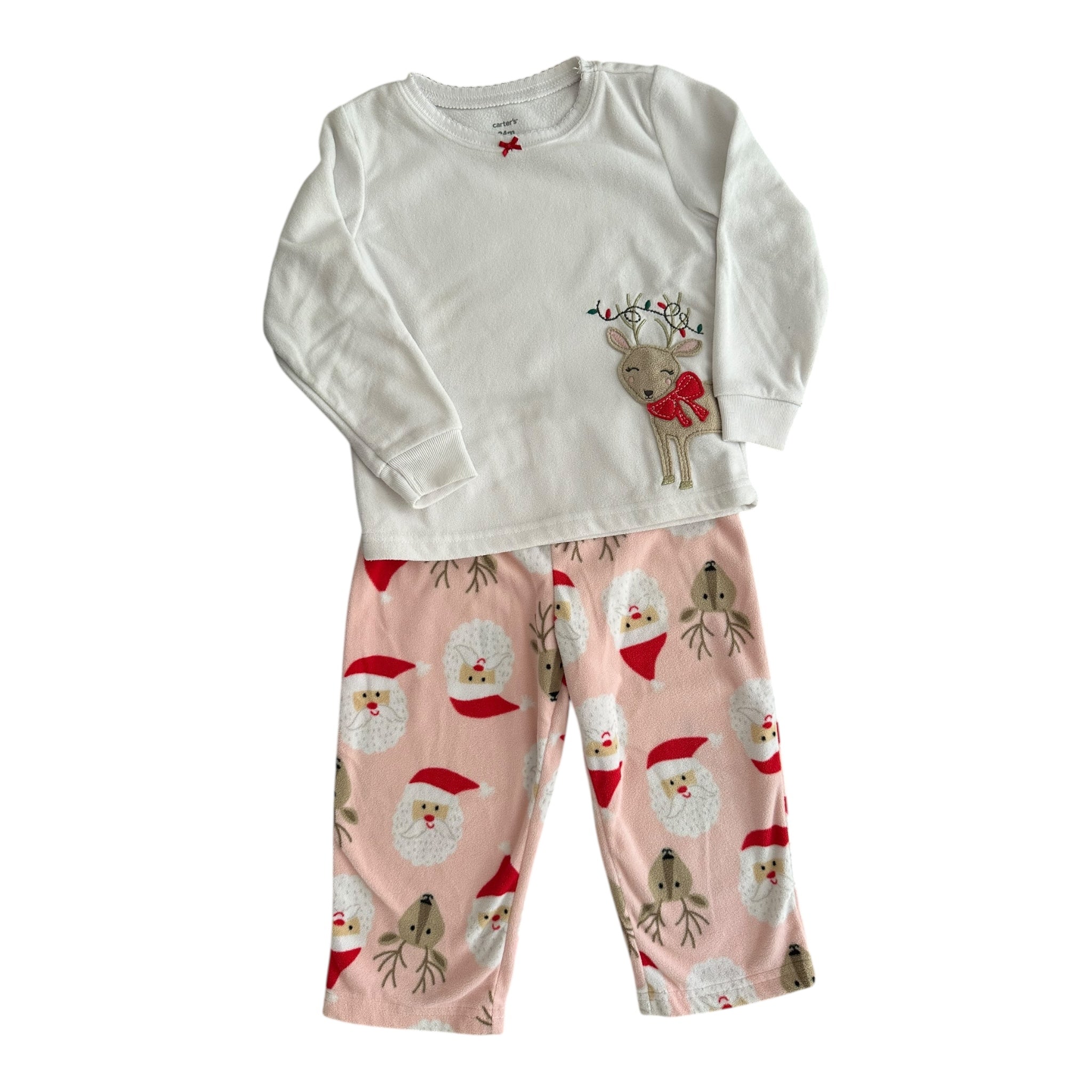 Pajama de dos piezas con top de franela blanca con reno y pantalón de franela rosado con santas y renos.